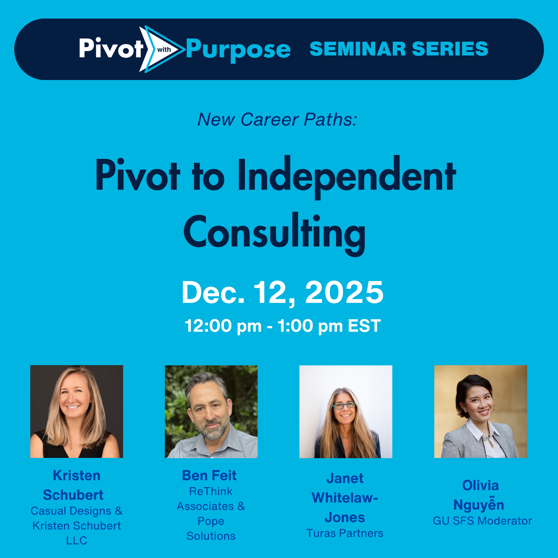 Pivot with Purpose, an initiative of the Georgetown School of Foreign Service with support from The Rockefeller Foundation, has been created by – and for – international development professionals to offer resources to guide your career transition. We are committed to helping affected people find new employment where they can use their skills in fulfilling and impactful positions.
