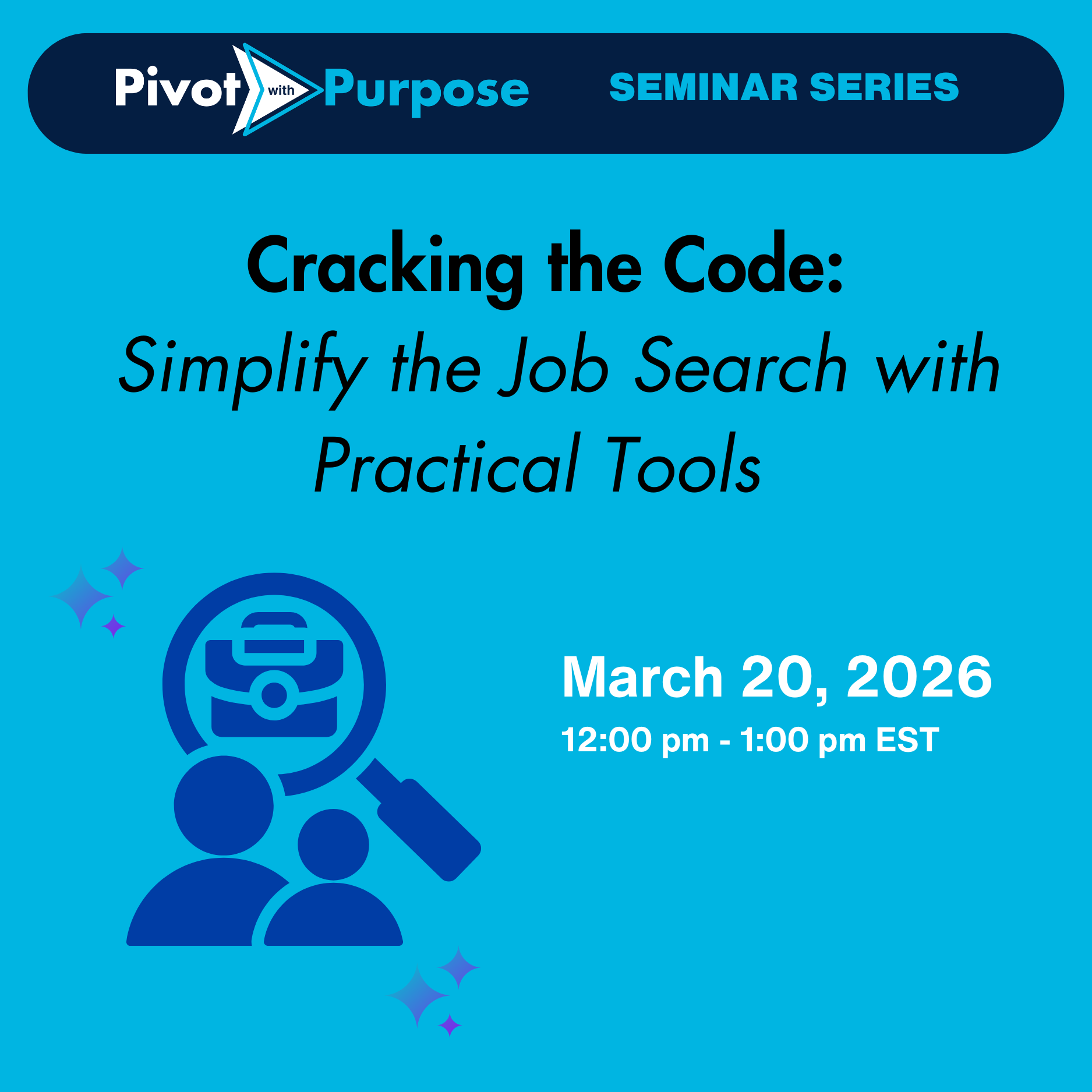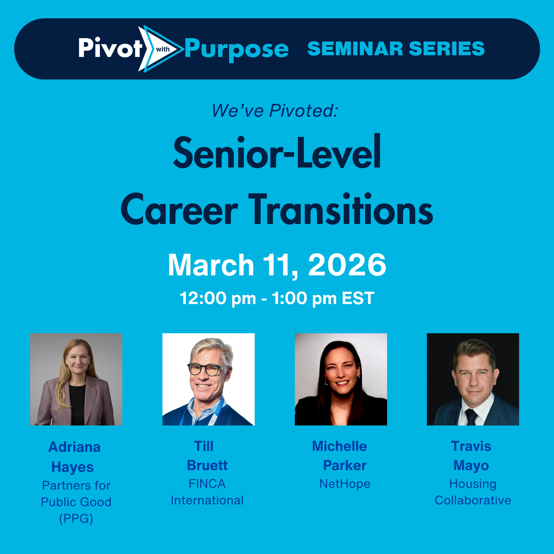 We welcome you to learn more about our Pivot with Purpose Seminar Series on best practices for your job search and pivoting to a new career which will run from June through late 2025. We also offer career advising sessions with industry experts and reciprocity rings, and a knowledge & resource center to connect you with jobs, tools, and support.